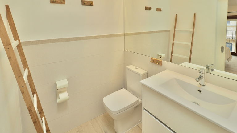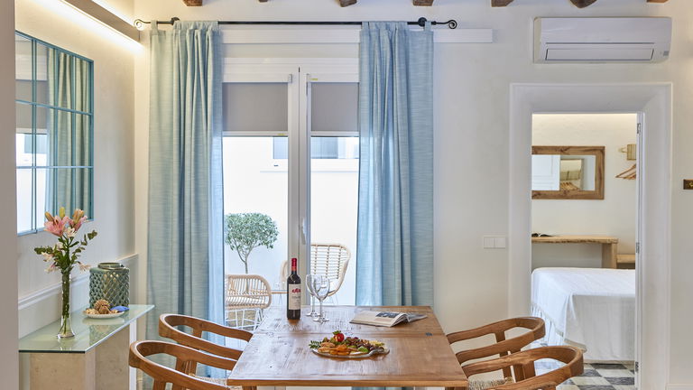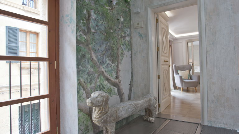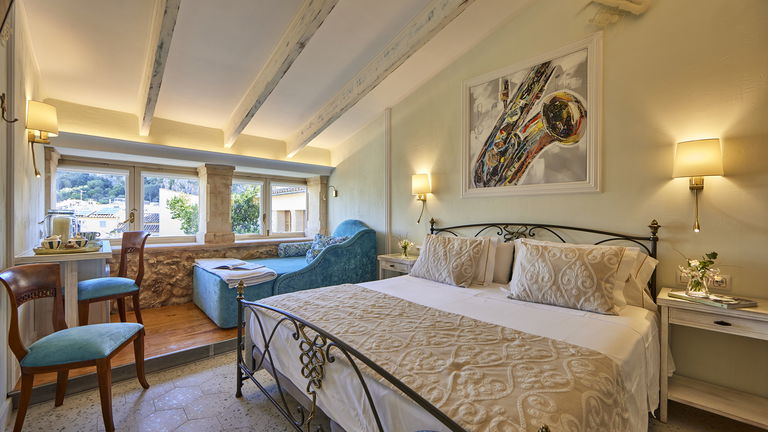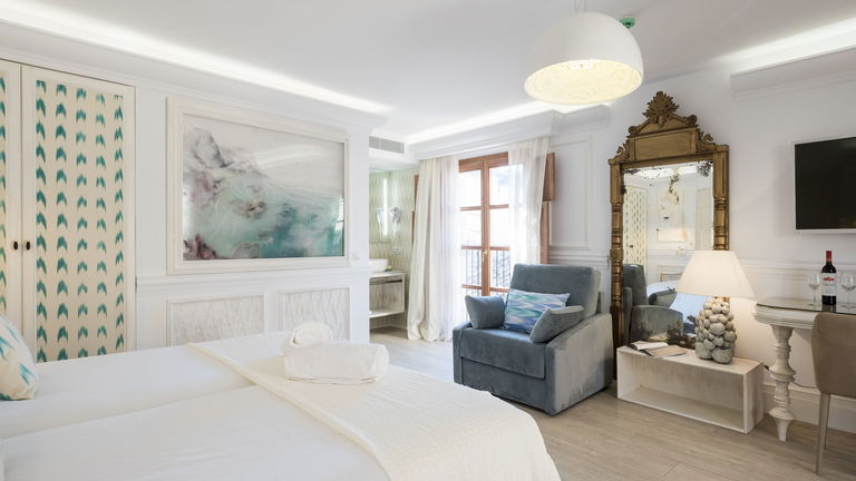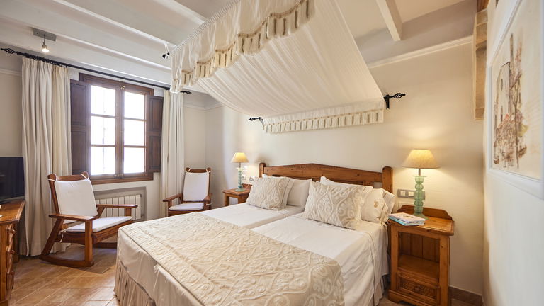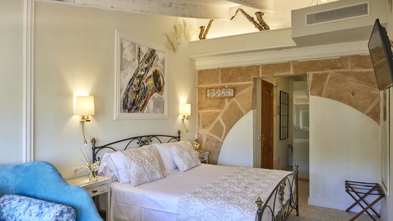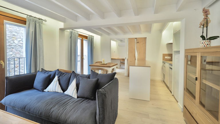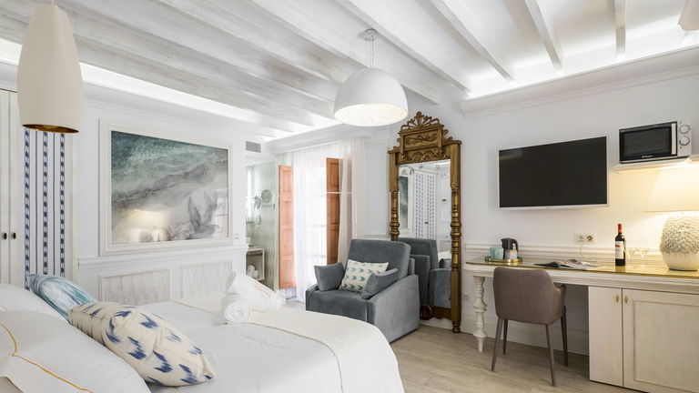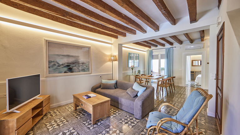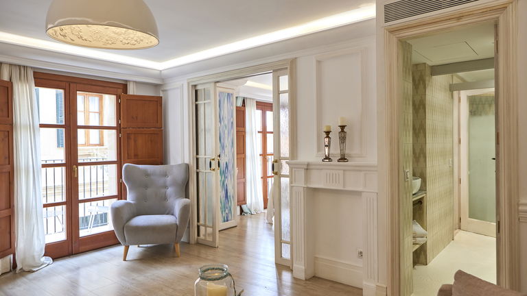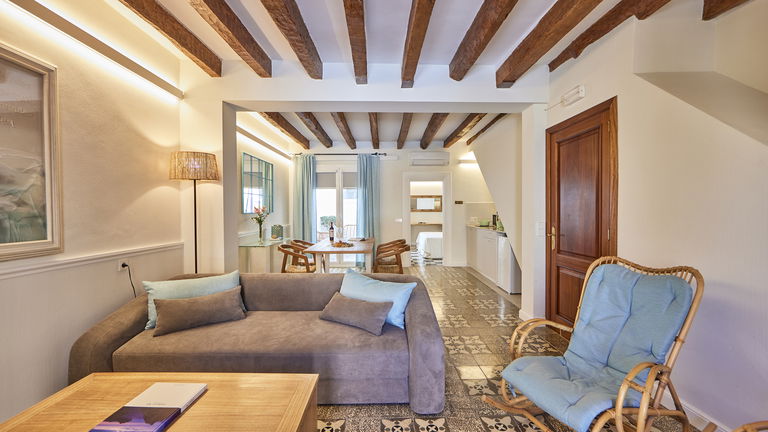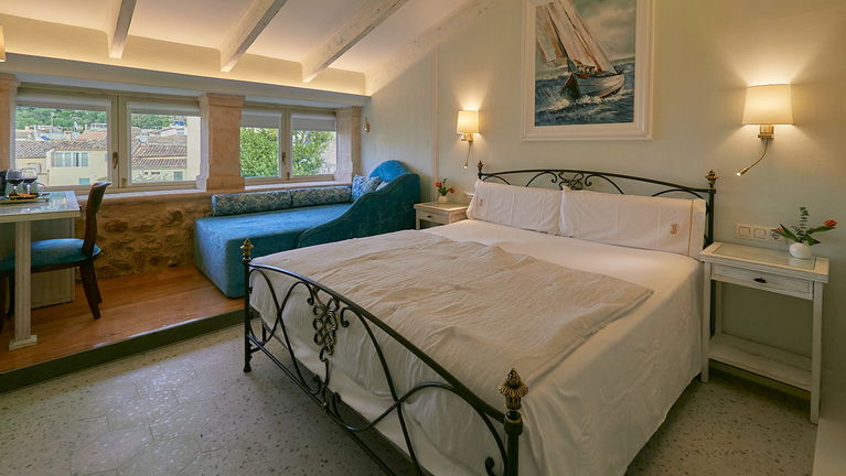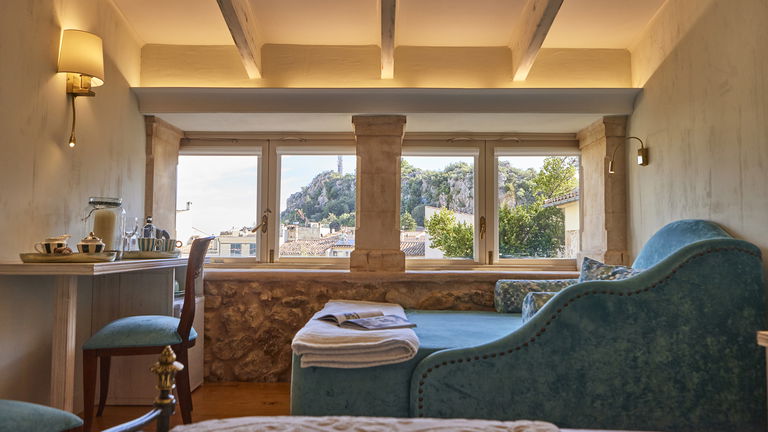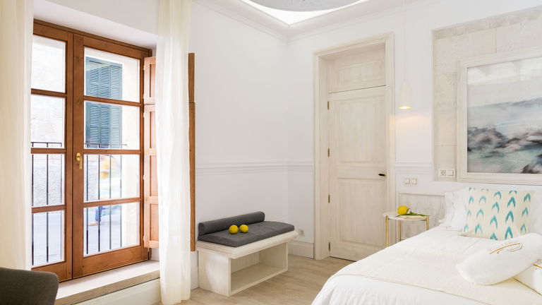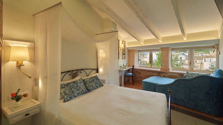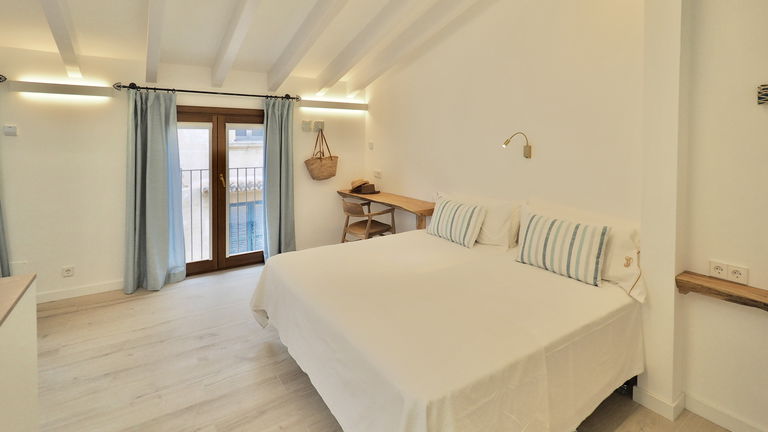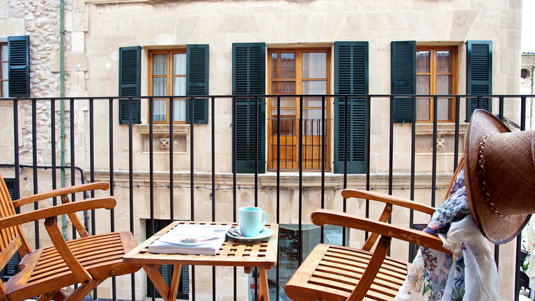 Destaca por sus grandes ventanales con balcón francés, ofreciendo vistas panorámicas al casco antiguo o a la encantadora Placeta Sant Jordi. Un lugar ideal para disfrutar de la tranquilidad y belleza del entorno.